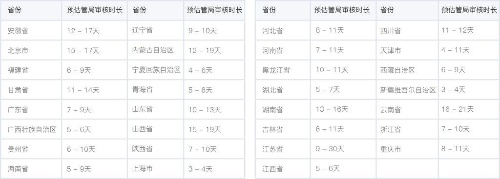 各個省管局預(yù)計審核時長,實際審核時長會根據(jù)備案場景有所不同,下表格僅供參考。詳情可查看 詳細規(guī)則。